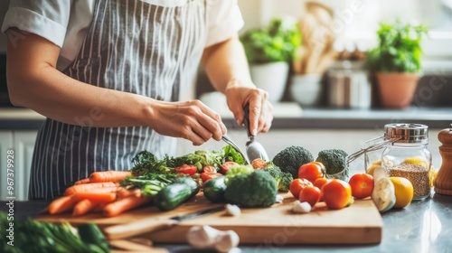 woman, cooking, kitchen, vegetable, food, healthy, fresh, meal, dinner, ingredient, nourishment, lifestyle, home, apron, cutting, chopping, broccoli, tomatoes, carrot, cucumber, cilantro, garlic, lemon, board, knife, utensil, dining, preparing, eating, domestic, culinary, vegetable, salad, cook, tomatoes, chef, hand, pepper, hand, preparation, cut, diet, people