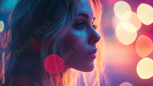 woman, portrait, profile, blue, pink, purple, neon, light, bokeh, night, city, mood, mysterious, dreamy, attractive, beautiful, face, hair, blond, closeup, colourful, abstract, background, glamour, fashion, style, trendy, elegant, sensual, youth, girl, photo, close, up, studio, lighting, view, female, model, shot, soft, dark