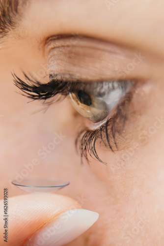 Woman putting contact lens in her eye, closeup. Concept vision correction, daily routine, personal care