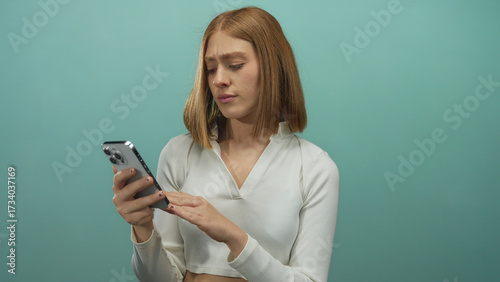woman, smartphone, puzzled, blond, white, confusion, isolated, blue, background, digital, frustration, emotion, technology, expression, female, young, adult, modern, device, holding, casual attire, attire, contemplative, gesture, mobile, phone, communication, portrait, lifestyle, using, screen, app, tech, connectivity, interaction, media, mobile phone, surfing, cyberspace, browsing, searching, engaged, thinking, pondering, glance, innovation, contemporary, minimalist, conceptual