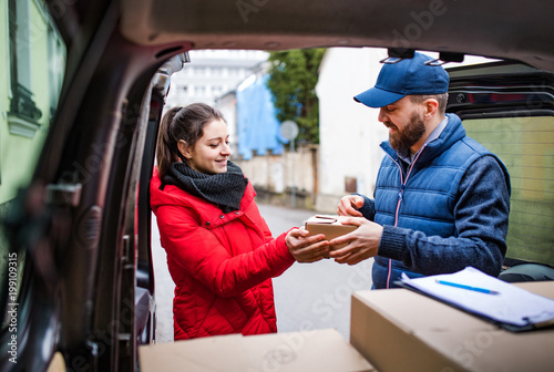 sipping, door, service, courier, delivery, man, parcel, box, box, recipient, concept, package, domestic, signature, delivering, client, freight, transport, signs, express, label, profession, cardbox, cargo, cardboard, postal, shipment, men at work, male, uniform, deliver, work, job, post, order, transportation, woman, female, signing, document, pen, red, winter, cold, weather, people, coat, boot, open