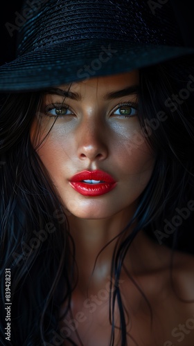 woman red lips black hat talented perfect facial face desirable forbidden beauty fair skinned scarry bewitching saint womans closeup indescribable