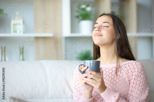 hot drink, drink, relax, tea, chill, woman, happy, breath, breathing, fresh, air, smell, smelling, well, being, home, mind, peace, people, hand, person, aroma, hotel, girl, cup, closed, eye, hold, favor, favor, mug, health, female, couch, sofa, sitting, breakfast, apartment, house, living, room, enjoy, homeowner, tenant, renter, tranquil, calm, profile, indoor