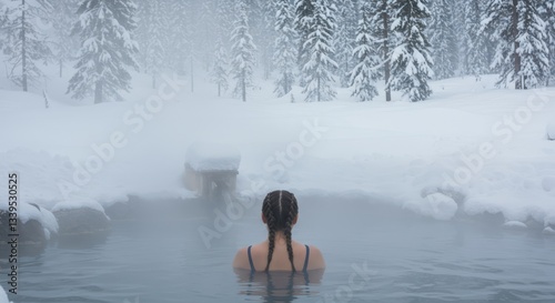 woman, bathing, relaxing, having fun, hot spring, winter, snow, tree, forest, landscape, nature, serene, mist, steam, water, cold, season, fresh, air, back, view, shoulder, braid, hair, leisure, activity, travel, tour tourism, wellness, lifestyle, escape, recreation, well-being, health, natural, environment, therapy, refreshing, quiet