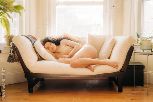 woman, relaxation, serenity, comfort, peaceful, cosy, softness, warmth, natural light, sunlight, glow, home, interior, couch, pillow, calmness, mindfulness, calm, resting, beauty, curly hair, elegance, beige, harmony, introspection, well-being, gentle, dreamy, breathing, stillness, contentment, quiet, soothing, indoor, morning light, meditative, restful, minimalism, massachusetts, us, one person, female, multiracial