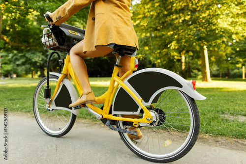 Woman riding yellow electric bicycle on the park road, cropped closeup shot on female legs and wheels