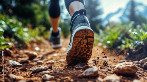 Woman running on a dirt path with her foot in the air. Concept of freedom and energy as the woman runs through the natural landscape