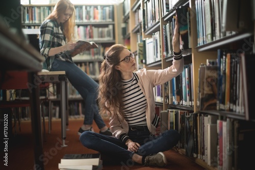 Woman searching a book from shelf in library