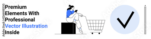 Woman seated holding smartphone near a shopping cart, large checkmark indicating quality or approval, pencil at side. Ideal for e-commerce, creative tools, digital content, user experience