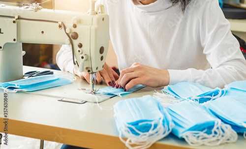 Woman sew the facial medical at sewing machine. Coronavirus pandemia.
