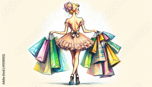 colours, line, drawing, full-length, happy, woman, shopping, bag, fashion, retail, purchase, smiling, joyful, stylish, trendy, casual attire, art, illustration, creative, artistic, spree, consumer, lifestyle, urban, city, life, modern, chic, accessory, footwear, apparel, clothing, boutique, store, mall, purchase, sale, discount, therapy, fun, excitement, expression, character, crayons
