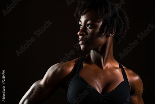 woman, fitness, fit, physique, athletic, athlete, activewear, abs, muscle, muscular, healthy, body, bodybuilder, bodybuilding, torso, pose, strong, physical exercise, adult, african, black, young, toned, strength, health, exercise, gym, train, lifestyle, well-being, posture, racked, confident, skin, studio, model, individual, personal trainer, confidence, sports bra, activewear, dark, background
