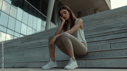 woman, sitting, step, urban, modern, architecture, pensive, thoughtful, calm, neutral, light, beige, white, shoe, outdoors, exterior, contemporary, fashion, young, adult, female, portrait, relaxed, city, street, stylish, minimalist, serene, image, photo, concrete, grey, long hair, brown hair, casual attire, calmness, urban scene, trendy, girl, cool