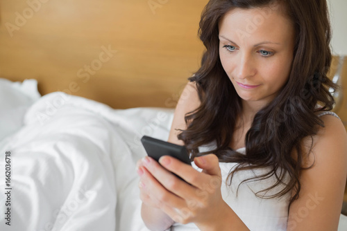 Woman sitting on bed holding smartphone and reading messages in bedroom, copy space