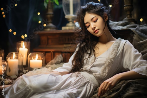woman, sitting, bed, candle, surrounded, cosy, warmth, home, relaxation, atmosphere, room, evening, interior, decor, comfort, lifestyle, female, leisure, quiet, bedchamber, night, calm, unwind, alone, lighting, glowing, romantic, meditative, meditation, flames, domestic, adult, resting