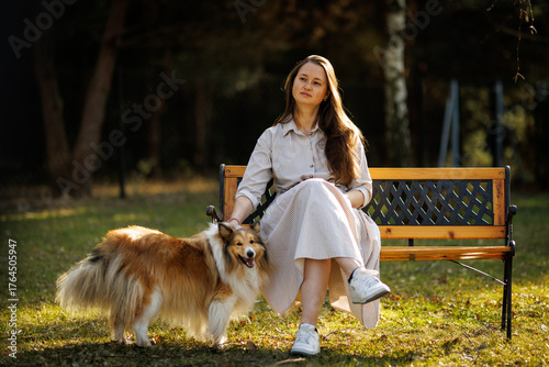 shetland sheepdog, shetland, sheepdog, woman, collie, dog, bench, pet, garden, sitting, fluffy, peaceful, nature, portrait, sunlight, friends, canino, affection, calm, companion, quiet, happy, animal, love, bond, bokeh, light, warm, daylight, together, friendship, relax, people, forest, posing, leisure, hugs, park, loyal, sunny, mammal, casual attire, cute, wooden