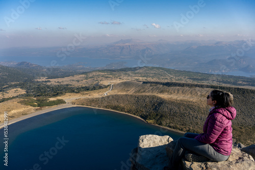 Woman sitting on rock with scenic view from Batea Mahuida and Alumine Lake. Villa Pehuenia, Neuquen, Argentina