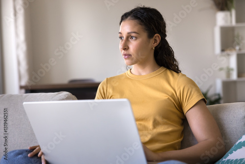 Woman sitting on sofa with laptop, looks aside with pensive expression, ponder on task while studying online, prepare assignment, busy in learning process using modern device and internet connection