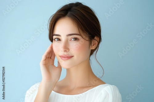 Woman Skincare Portrait with Pastel Blue Background and Gentle Gesture