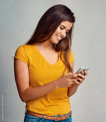 Woman, smile and texting with smartphone in studio background for social media, networking and online dating. Female person, happy and notification with good news, text message and entertainment