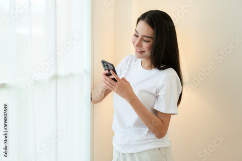 woman, smartphone, window, room, bright, smiling, engaged, technology, indoor, leisure, casual attire, lifestyle, happiness, communication, day, relaxation, home, joy, textile, personal, screen, connection, modern, fashion, young, female, standing, beauty, contentment, atmosphere, cosy, natural, light, expression, shield, texting, candid, playful, enjoyment, social, wear, everyday, life, activity, interaction, moment, decor, serene, calmness