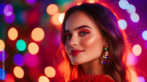 Woman smiling, festive lights bokeh background, holiday makeup, portrait