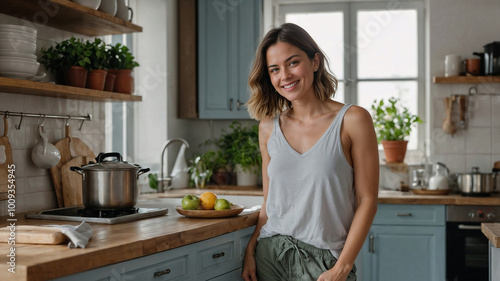 woman, kitchen, smiling, casual attire, home, lifestyle, cooking, natural, cosy, morning, bright, fresh, fruit, healthy, happiness, relaxed, casual clothes, domestic, modern, plant, joy, peaceful, warmth, light, comfort, cheerful, home cooking, simplicity, indoor, companionship, serene, real, positive, minimalist, contentment, breakfast, rustic, friendly, happy, interior, preparing