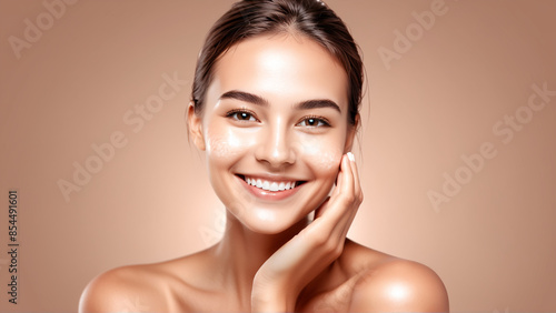beauty, skin, face, skincare, make-up, copy space, natural, healthy, care, model, hair, fresh, closeup, shiny, sheer, glossy, woman, smiling, clean, lady, blank space, fashion, cosmetic, teeth, touching, flawless, youthful, young, beautiful, radiance, glow, youthfulness, vibrant, carefree, freshness, confidence, brunette, joy