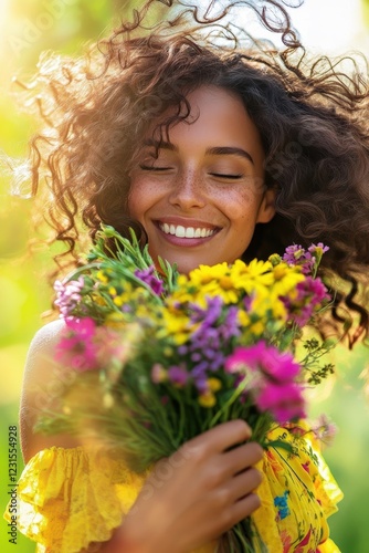Woman smiling with a bouquet of colorful flowers in a sunny field, embodying joy and connection to nature. Perfect for wellness, happiness, and spring themes.
