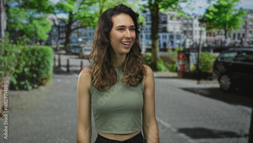 woman, mouth, smiling, street, hispanic, young, female, green, city, joy, grin, laughter, happiness, delight, bliss, cheer, enjoyment, smile, glee, building, facades, foliage, tree, car, brunette, adult, lady, cheerful, upbeat, optimism, positivity, elation, exhilaration, joyfulness, merriment, radiance, jubilation, thrill, beaming, emerald, olive, sleeveless, tank top, feminine, vibrant, lively, natural, casual attire