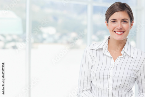 Woman standing and smiling in business casual attire in bright office by large windows, copy space