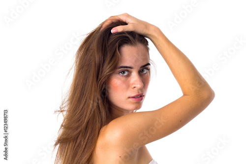 adult, female, elegance, studio, fashion, hair, long, young, beautiful, posing, attractive, standing, person, people, 1, looking, woman, indoor, lifestyle, fashionable, emotion, caucasian, colours, human, beauty, femininity, white, background, chestnut, naked, fixing