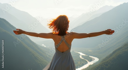 woman, mountain, view, landscape, freedom, travel, nature, photo, arm, outstretched, serene, peaceful, majestic, huge, aerial, panoramic, exploration, journey, calmness, silhouette, vista, horizon, river, vale, windblown, elegant, dress, back, sunlight, atmospheric, aethereal, scenic, outdoors, wide, open, graceful, solitude, beauty