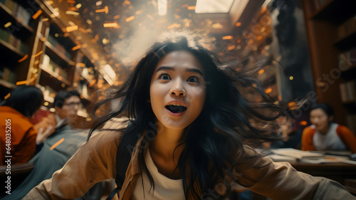 woman, standing, library, surprise, book, reading, cognition, learning, education, research, study, academic, literature, information, shelf, bookshelf, bookworm, intellectual, scholar, student, studying, intelligent, amazement, astonish, amazed