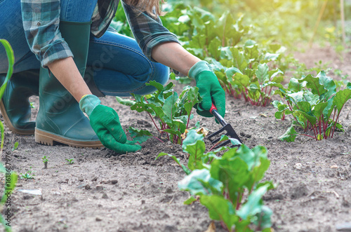 Woman thinning beets, wearing checker shirt and gloves. Organic farming, growing organic vegetables