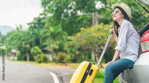 Woman traveler sitting on hatchback car with nature background in vintage tone