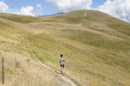 adventure, clothing, countryside, hiking, hill, landscape, mountain, mountain chain, nature, outdoors, recreation, road, sky, sports equipment, summer, tree, trekking, vacation, vale, walk, walking