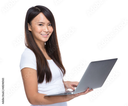 woman, lady, girl, female, korean, chinese, asia, asian, laptop, notebook, digital, technology, computer, electronic, portable, use, surfing, touch, type, young, teenage, teenage, isolated, white, background, people, person, portrait, 1, cut-out, studio, tee, t-shirt, blouse, clothes, sweater, cardigan, sleeve, apparel, tank