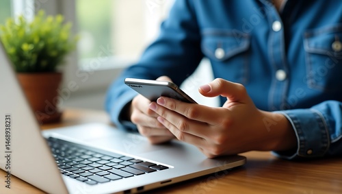 Woman using a smartphone near a laptop computer at a wooden table with a plant.