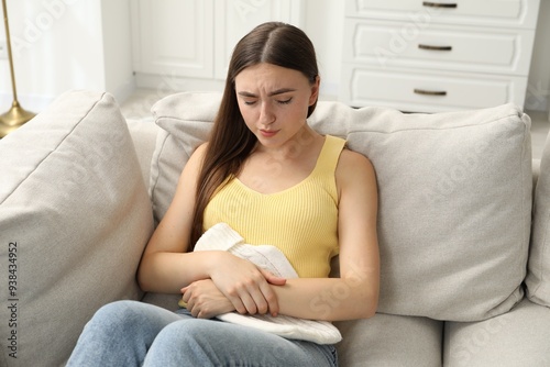 Woman using hot water bottle to relieve menstrual pain on sofa at home