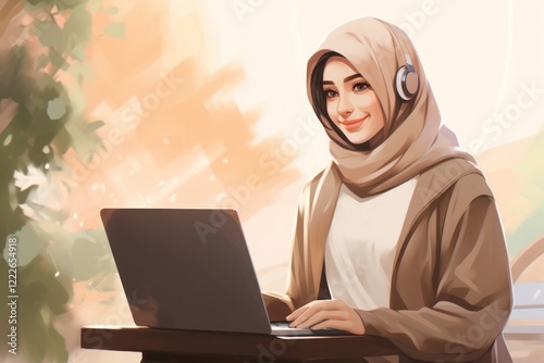 computer network, casual clothes, businesswoman, illustration, electronic, portability, young adult, creativity, earphones, human hair, one person, technology, beautiful, executive, headscarf, listening, clothing, computer, portrait, waist up, apparel, looking, sitting, smiling, working, electronic mail, female, joyful, laptop, people, typing, adult, human, foulard, using, woman, face, head, nice