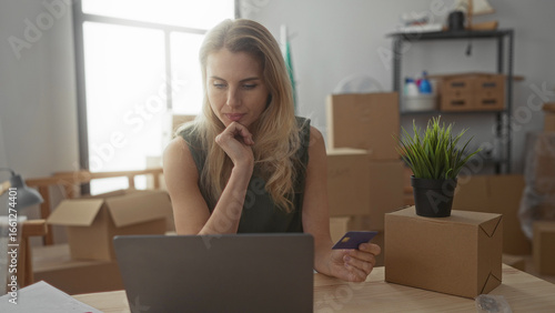 woman, laptop, home, blond, indoor, cardboard, credit, shopping, room, caucasian, relax, apartment, purchase, interior, move, furniture, technology, unpack, cyberspace, payment, lifestyle, young, online, plant, desk, personal, relocation, workspace, casual attire, modern, girl, leisure, computer, routine, female, digital, bright, new, urban, setup, individual, person, youth, background, shelving, brightness, comfort, contemporary