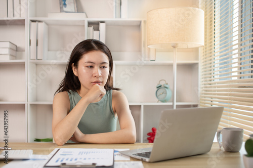 Woman using laptop to work or do homework at home with smiling face in her office, Creating happiness at work with a smile, Live performance or vdo call with laptop, Work from home.