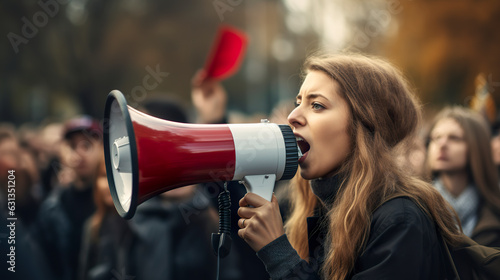 Woman using megaphone to protest during a demonstration as a female activist. A woman engaged in activism, using a megaphone to make her voice heard amidst a demonstration. Generative AI