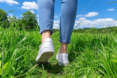 woman, walking, grass, path, sunny day, sneaker, jean, outdoors, nature, lifestyle, travel, fashion, wellness, freedom, relaxation, active, green, blue, white, footwear, casual attire, summer, recreation, journey, adventure, leisure, exercise, healthy, tranquil, peaceful, scenic, environment, background, beautiful, calm, cloud, countryside, field, landscape, meadow, fresh