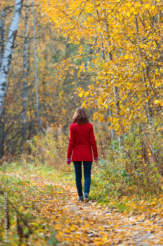 Woman walks alone in autumn forest. Rear view