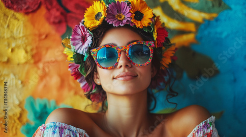 Woman wearing colorful sunglasses and flower crown poses against vibrant backdrop