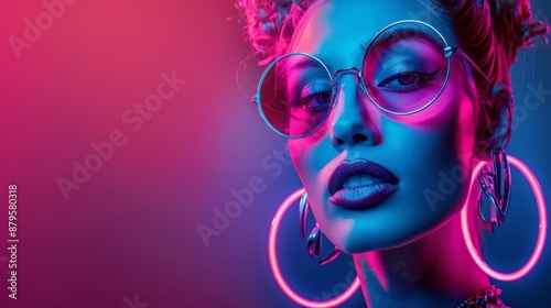 woman, face, pink, neon, hoop, earring, round, sunglasses, blue, lighting, fashion, portrait, model, style, beauty, glow, vibrant, colourful, glamour, cool, trendy, bright, eye, lip, hair, closeup, studio, shoot, aesthetic, modern, bold, edgy, confident, expressive, contemporary, graphic, design, art, digital, imagery, visual, impact, abstract, mood