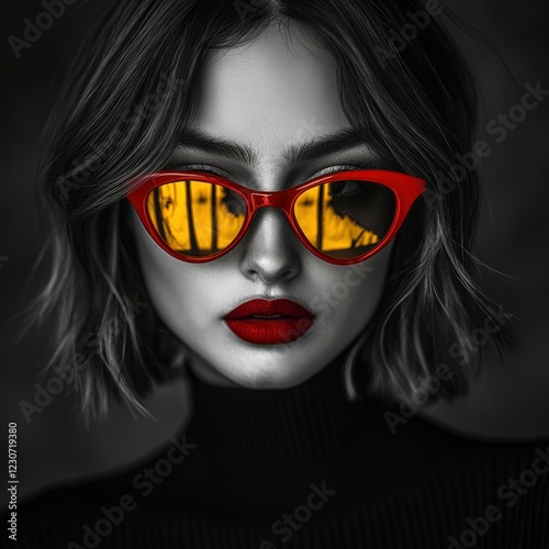 woman, red, sunglasses, yellow, reflections, bold, lip, monochrome, portrait, fashion, chic, style, beauty, accessory, hair, short, dramatic, contrast, aesthetic, model, elegant, striking, trendy, art, expression, glamour, urban, nightlife, make-up, modern, vintage, personality, confidence, vibrant, eye, bright, detail, relaxed, cool, atmosphere, enigmatic, theme, emotion, unique, captivating, alluring, look, creative, stylish
