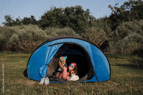 Woman wearing sunglasses taking selfie with dog while lying in tent
